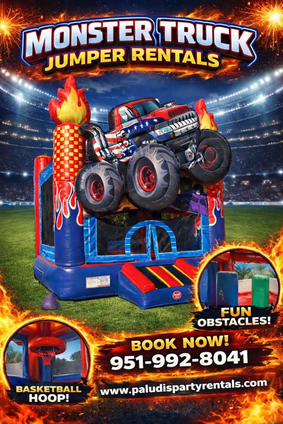 Paludis Party Rentals proudly offers Monster Truck Bounce House Rentals throughout the Inland Empire, including Moreno Valley, Riverside, Menifee, Perris, Beaumont, Yucaipa, Corona, Lake Elsinore and surrounding Southern California cities.