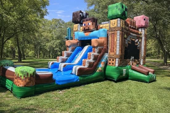 Level up your party with our 3D Minecrafted Fun Jumper Combo! This exciting inflatable features a pixel-style video game design, complete with slide and basketball hoop, delivering jumping, climbing, sliding, and active play all in one fun unit. Perfect for birthday parties, school events, church celebrations, and family gatherings.