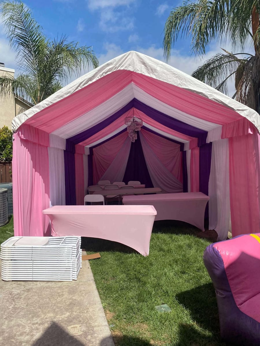 The 12x20 Luxury Package is the favorite for elopements and private dinners. Contact us today to choose your draping colors and start your backyard transformation.