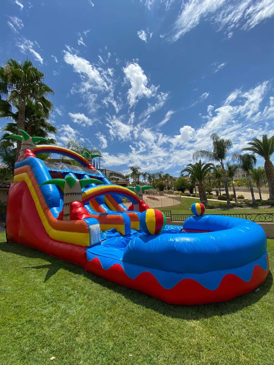 Ideal for birthday parties, backyard parties, school events, church events, and large summer gatherings, this double water slide keeps kids and teens entertained while staying cool on hot days. The vibrant tropical oasis design adds a resort-style look that instantly upgrades any party setup.