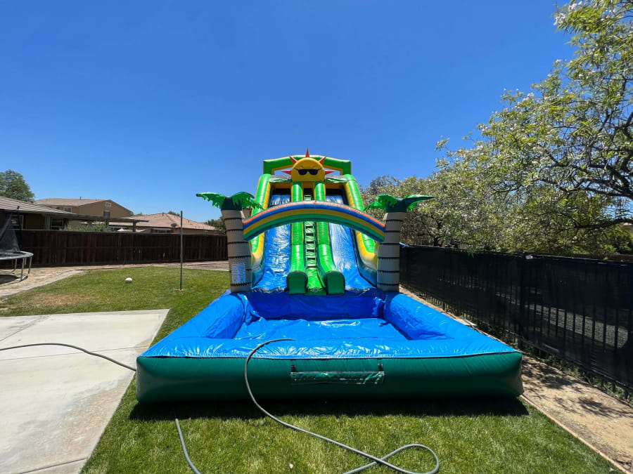 Turn up the summer fun with our Tropical Sunshine Double Lane Tall Water Slide Rental, proudly serving Riverside County, including Riverside, Moreno Valley, Menifee, Perris, Beaumont, and Yucaipa. This exciting inflatable features two side-by-side racing lanes, a tall climbing wall, and a fast, refreshing slide, making it perfect for friendly competition and nonstop excitement.